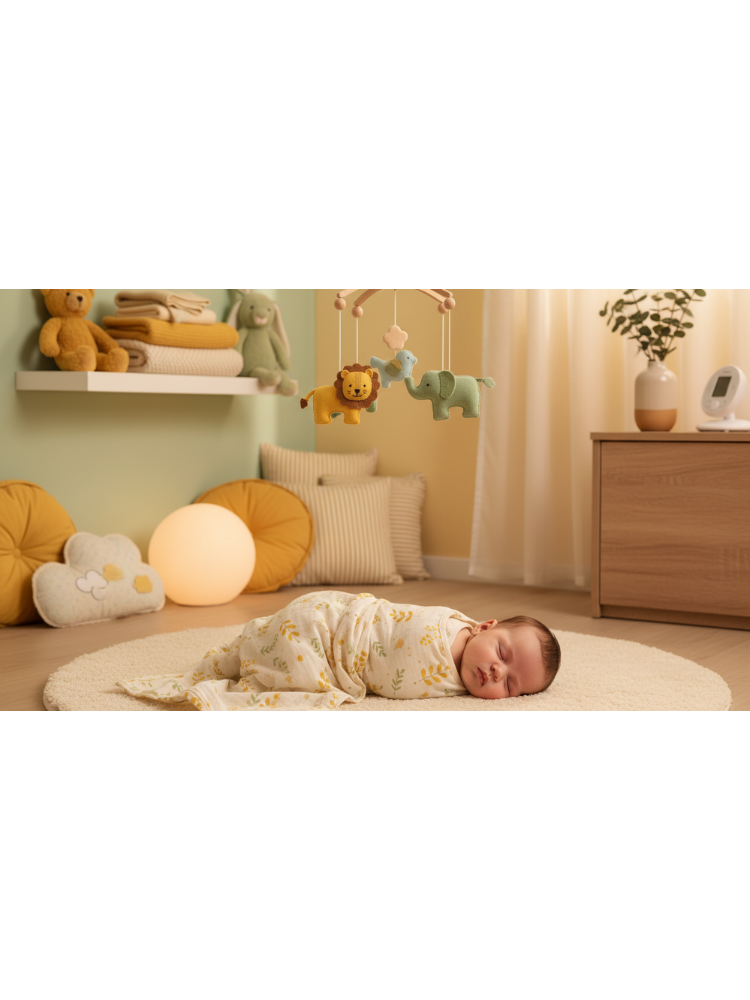 The soft music of the musical mobile accompanies this precious moment, creating an atmosphere of calm and well-being.